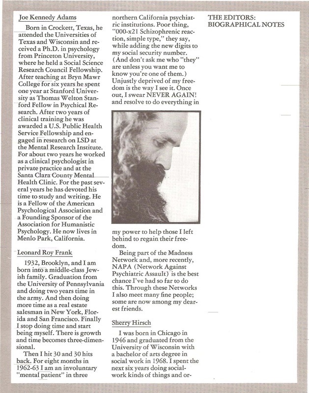 co-founding Network Against Psychiatric Assault(1974), both based in San Francisco and